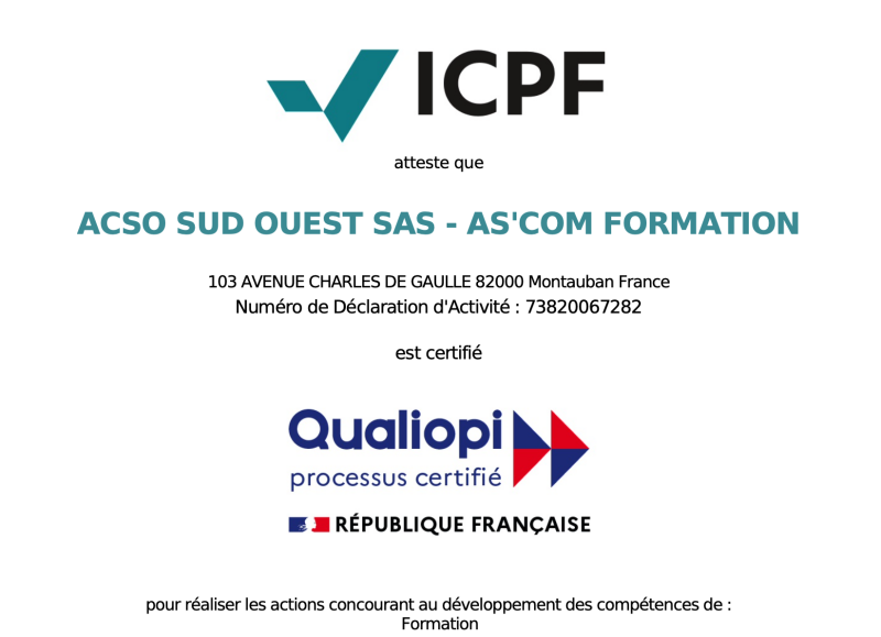 AS’COM Formation est un acteur concourant au développement des compétences dont le siège social est situé à Montauban (82). N°SIRET : 798 409 330 00023